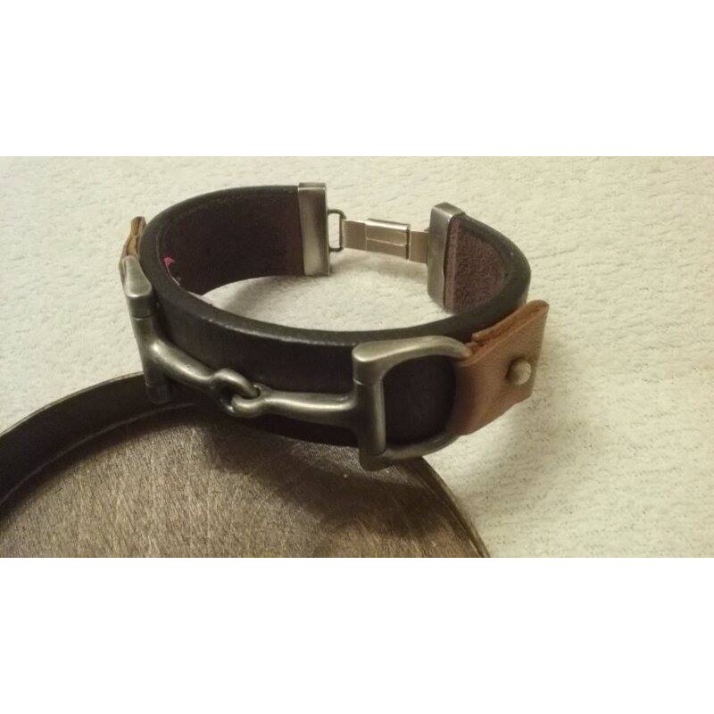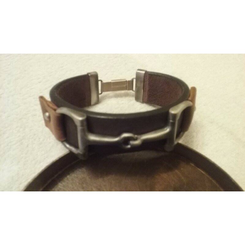 Bransoleta na brązowym, szerokim skórzanym pasku z motywem wędzidła.