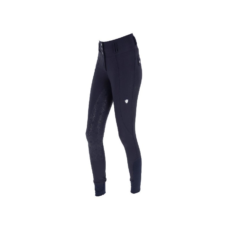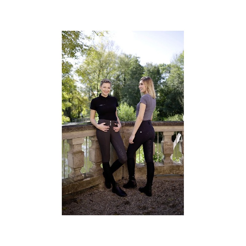 Eleganckie bryczesy podkreślające sylwetkę z wysokim stanem oraz pełnym lejem silikonowym marki Covalliero. Zapinane na 3 haftki i zamek. Wykonane z elastycznego, oddychającego materiału. Z boku, na udzie poręczna kieszeń na telefon. Posiadają elastyczne zakończenie nogawek.