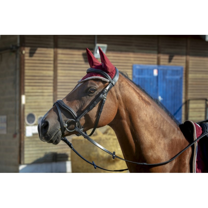 Bawełniany czaprak pikowany w fale, miękko podszyty, zdobiony kontrastową beżową lamówką oraz białym sznurem. W zestawie z nausznikami