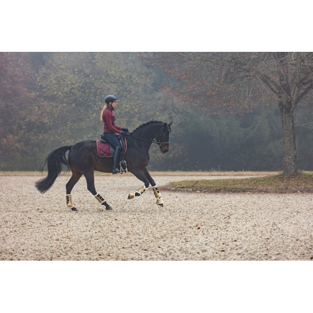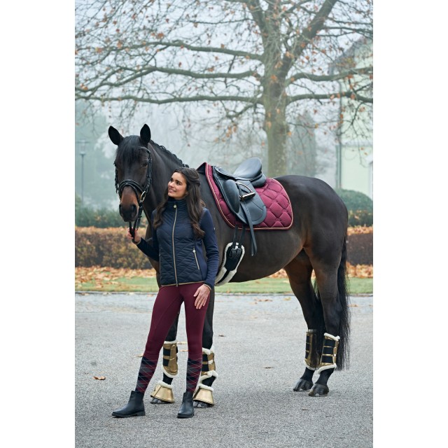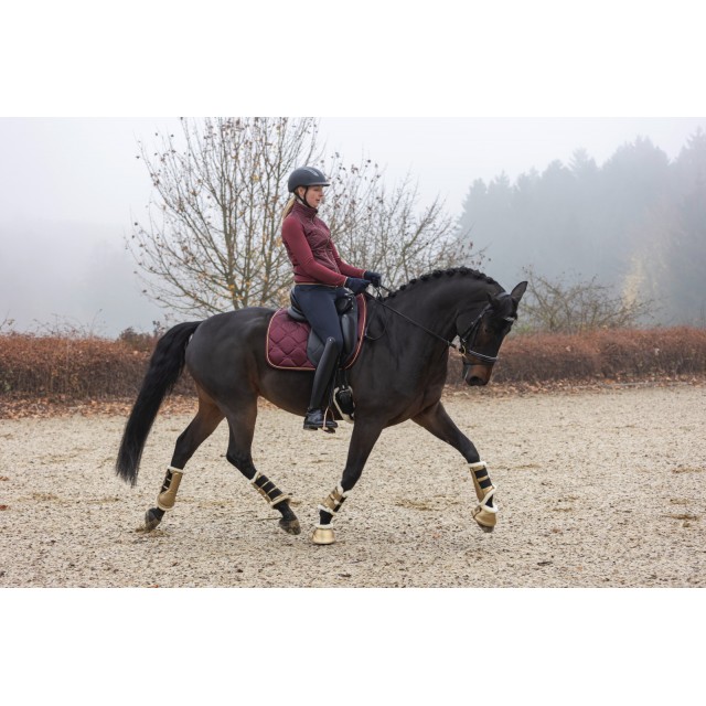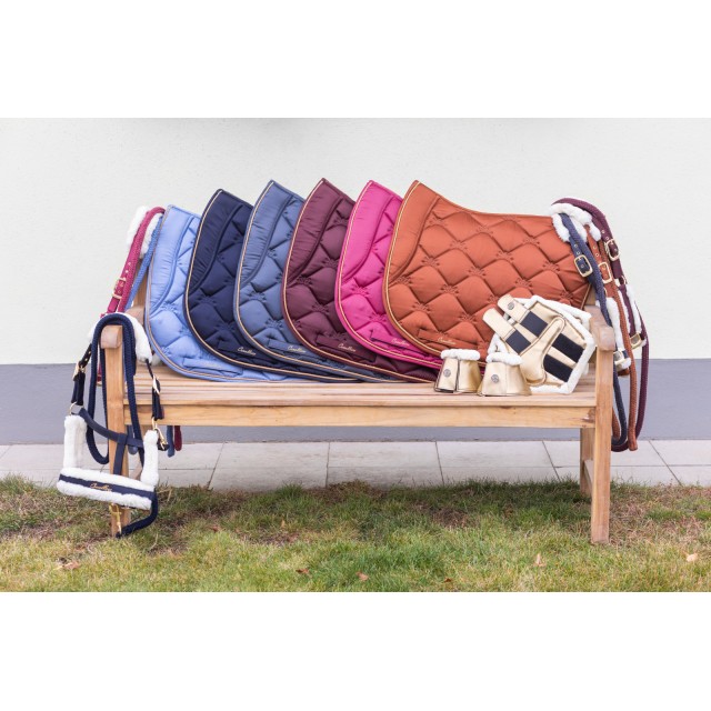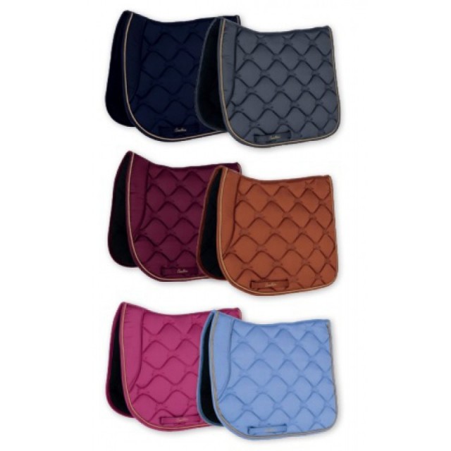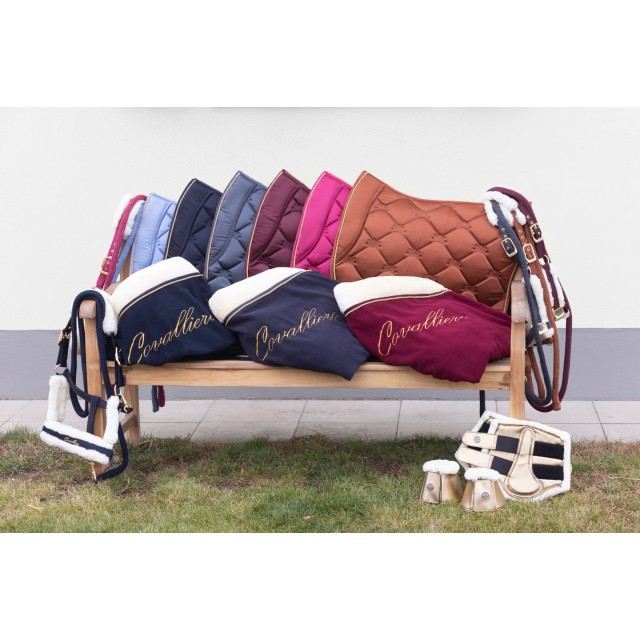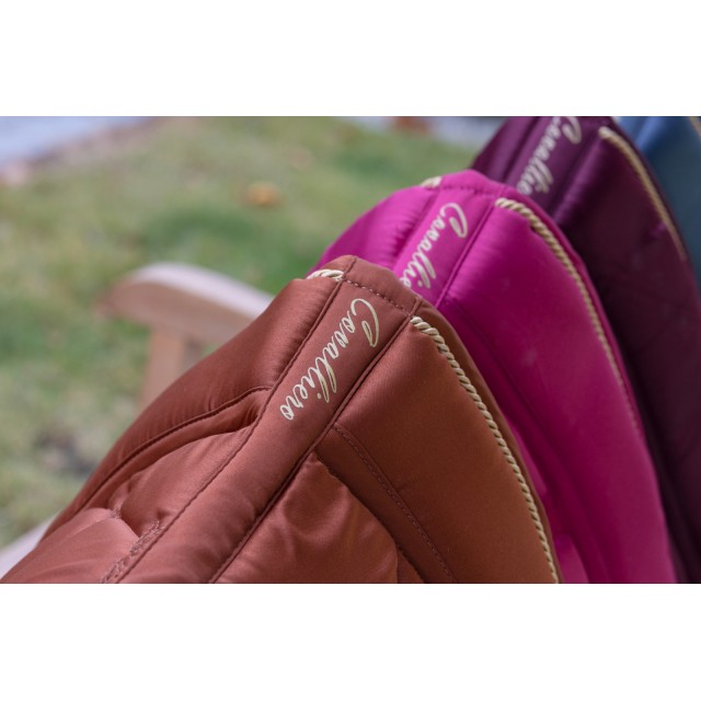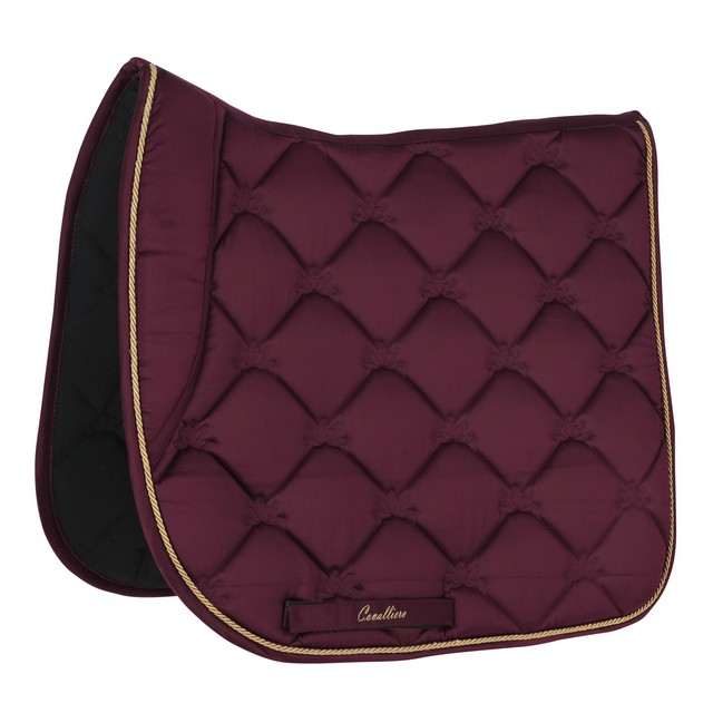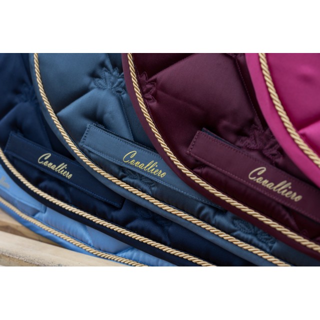 Piękny czaprak wykonany z lekko połyskującej, satynowej tkaniny. Subtelny z atrakcyjnym, eleganckim pikowaniem, złotym sznurkiem i haftem Covalliero, idealnie pasuje do odzieży jeździeckiej z nowej kolekcji. Posiada wysokiej jakości wypełnienie z pianki i poliestru, anatomiczny kształt, szybkoschnącą i oddychającą siateczkę od spodu oraz szlufki na popręg z zapięciem na rzepy.