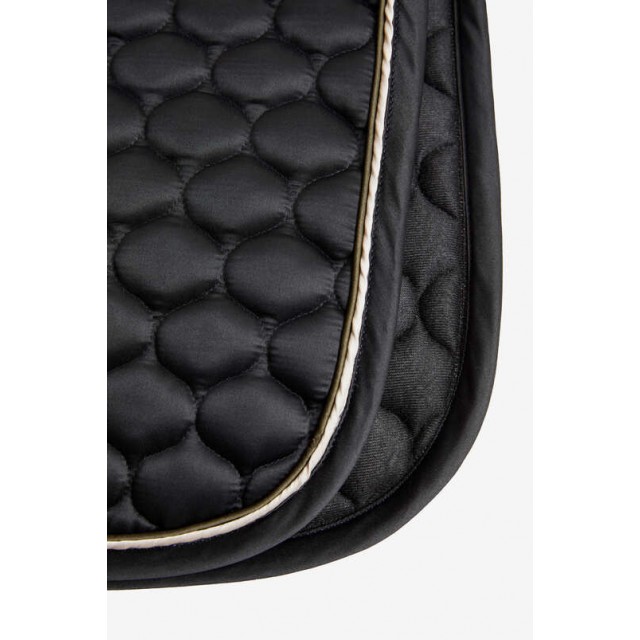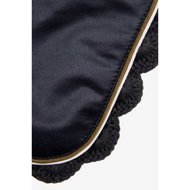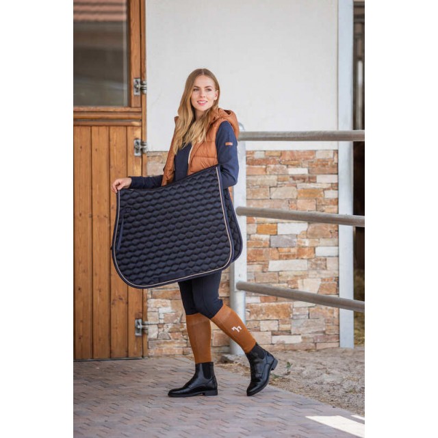 Czaprak "Sandnes" firmy Horze wykonany został z satynowego, błyszczącego materiału na zewnątrz, a od środka posiada czesaną szybko schnącą podszewkę. Pikowany tak aby miękko układał się pod siodłem. Dwa paski na rzepy pozwolą łatwo przymocować czaprak do siodła. Eleganckie wykończenie stanowi dwukolorowa lamówka wzdłuż brzegu.