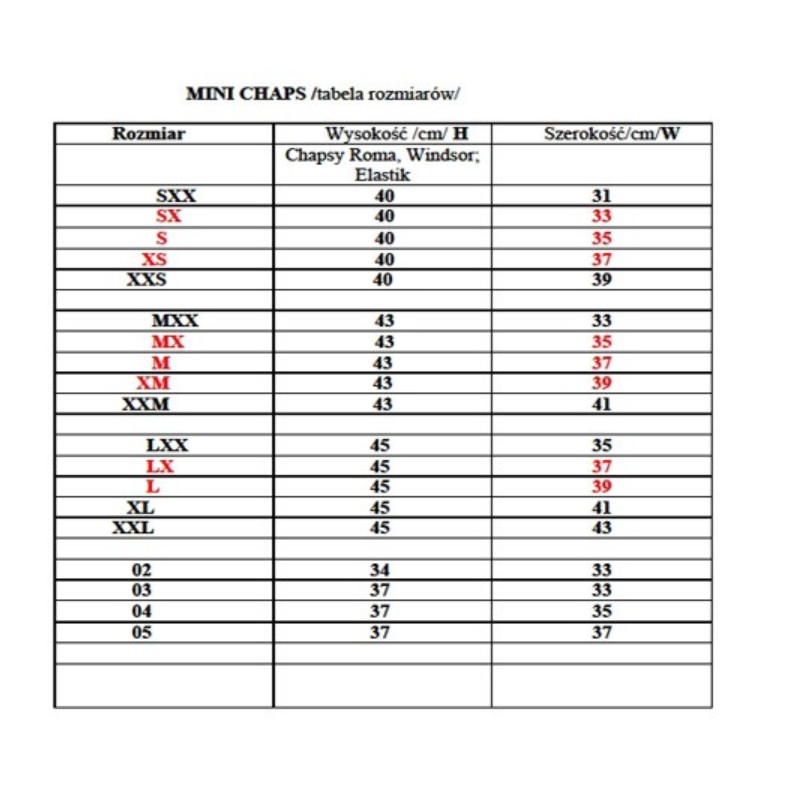 Rozmiary: SXX, SX, S, XS, XXS, MXX, MX, M, XM, XXM, LXX, LX, L, XL, XXL, 00, 01, 02, 03, 04, 05