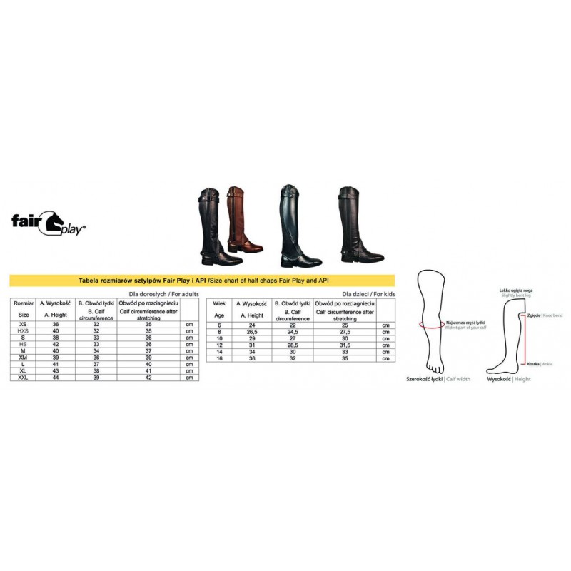 Sztylpy skórzane "Standard" Fair Play z boku zapinane na suwak. Posiadają elastyczną, gumową wstawkę pokrytą skórą, która umożliwia dobre dopasowanie do łydki. Od góry dodatkowe zapięcie na rzep.