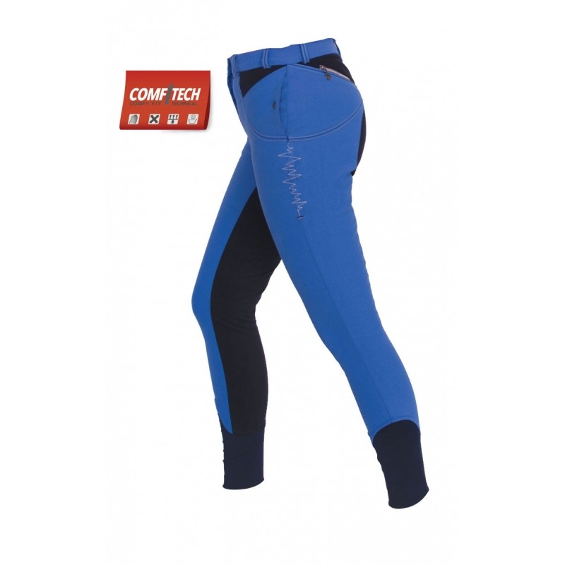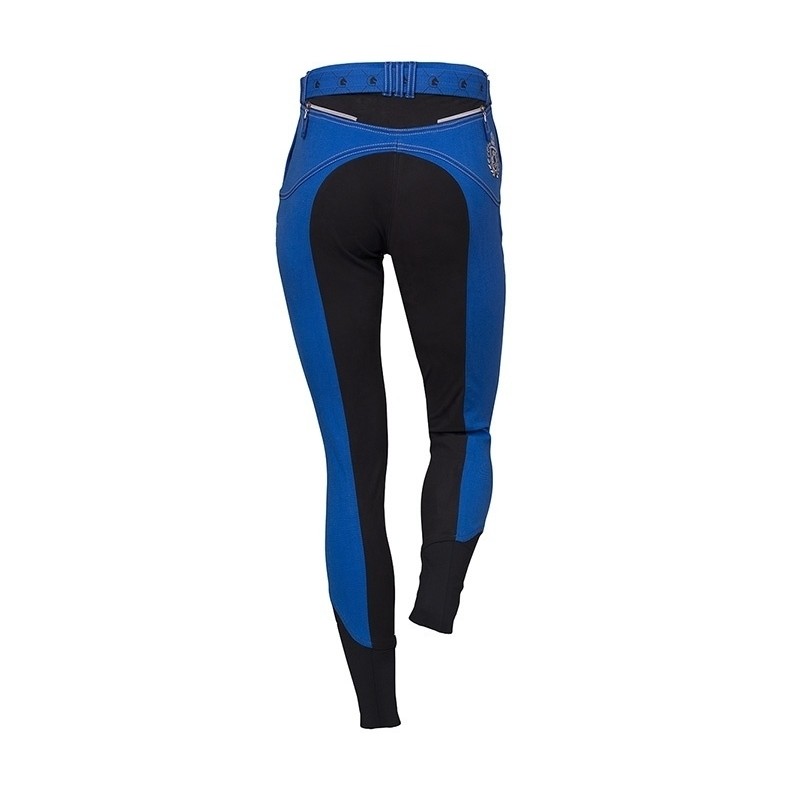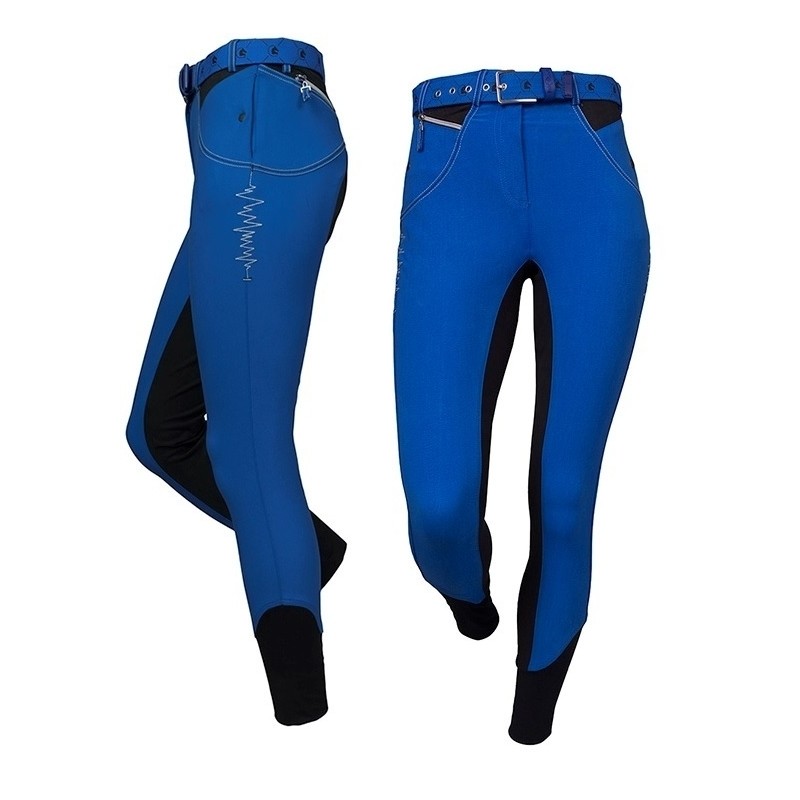 Bryczesy Fair Play "Electra" z pełnym lejem z nowoczesnego, elastycznego, rozciągliwego w czterech kierunkach materiału Comfitech. Spodnie w kolorze niebieskim z kontrastowymi przeszyciami oraz charakterystycznymi zygzakami na bokach. Z przodu posiadają 2 kieszonki zapinane na napy i jedną na zamek, z tyłu zaś zamki z imitacjami kieszeni.