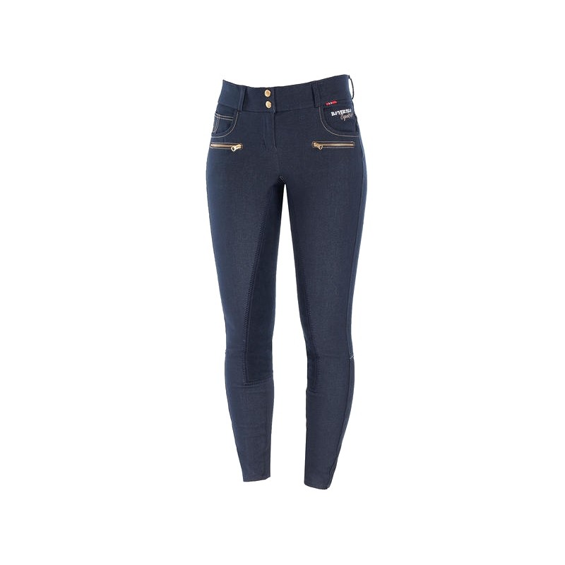 Bryczesy damskie "Tracy" marki B//Vertigo wykonane z wysokiej jakości elastycznego materiału jeansowego. Posiadają pełny lej zamszowy oraz nogawki zakończone elastycznym materiałem dla jeszcze większego komfortu noszenia. Przeszycia w kontrastującym kolorze. Z przodu ozdobione dwoma złotymi suwaczkami oraz wyhaftowanym logo producenta. Z tyłu dwie kieszonki, na jednej ozdobny haft z logo.