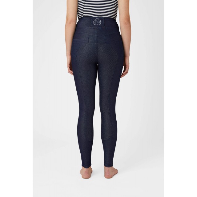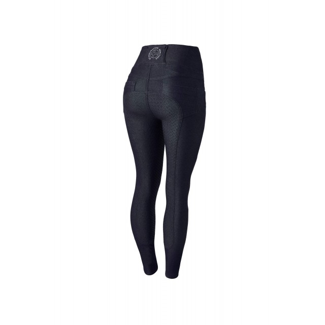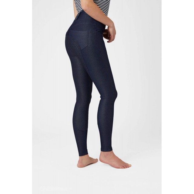 Denimowe legginsy jeździeckie to idealne i wygodne połączenie bryczesów i jeansów. Wyjątkowo lekki, elastyczny oraz przewiewny materiał sprawdzi się podczas codziennych treningów, ponieważ nie powoduje przegrzania. Wysoki stan zgrabnie podkreśli sylwetkę i sprawi, że legginsy nie będą się zsuwały. Pełny lej silikonowy zapewni dobrą przyczepność w siodle.