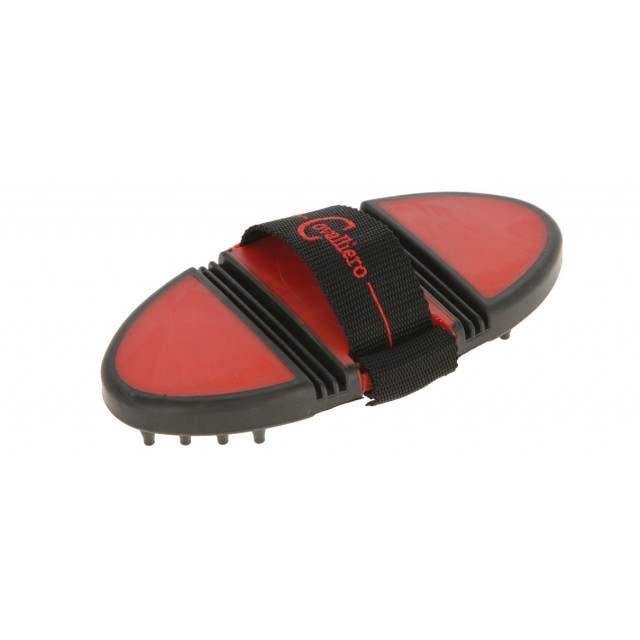 Zgrzebło z wypustkami z podwójnie zginanym grzbietem. Anatomicznie dopasowana nakładka z wypustkami zapewnia wyjątkowy masaż. Przyczepna powierzchnia dzięki antypoślizgowym wkładkom. Regulowana opaska trzymająca z poliamidu.