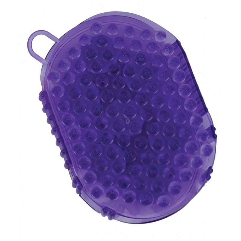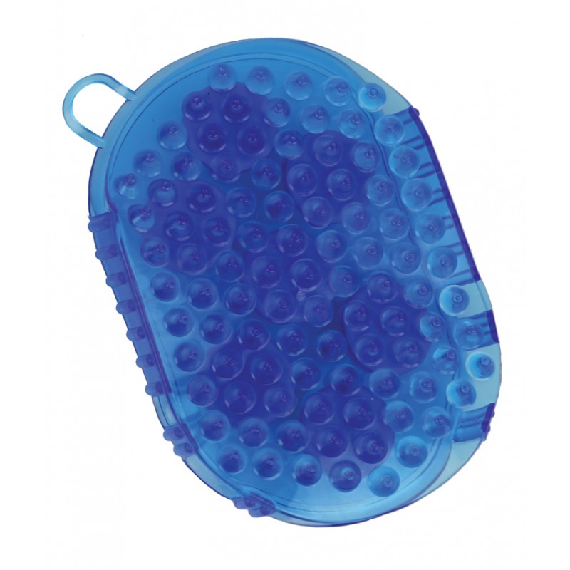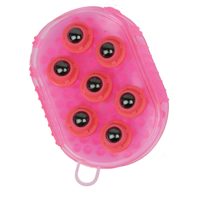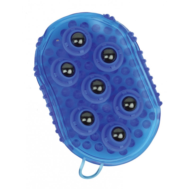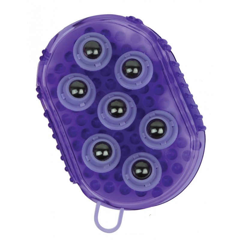 Dwustronna rękawica do masażu konia. Po jednej stronie gumowe wypustki, a po drugiej metalowe kulki.