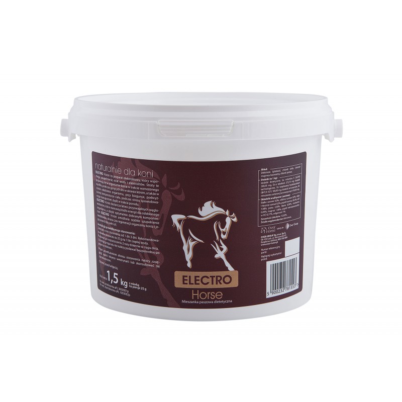Elektrolity "Electro horse" to preparat utrzymujący równowagę wodno- elektrolitową w organizmie. Produkt ten jest szczególnie ważny podczas dużego wysiłku, treningów, wysokiej temperatury, osłabienia organizmu, wystąpienia biegunki, transportu, porodu itp. Preparat zapobiega odwodnieniu organizmu, uzupełnia niedobory elektrolitów, oraz skraca czas regeneracji organizmu.