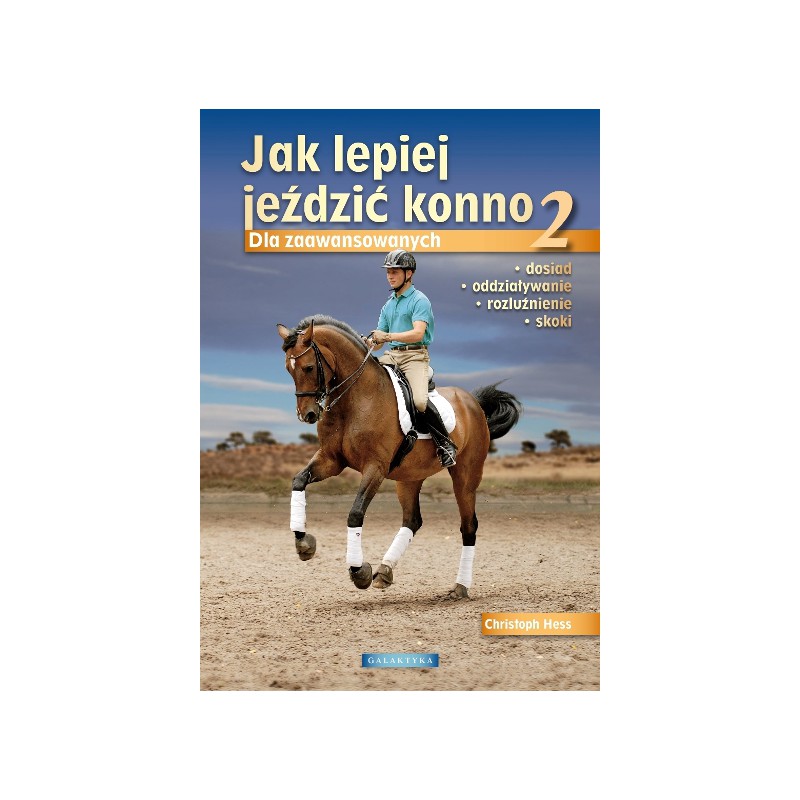 Książka Christopha Hess "Jak lepiej jeździć konno cz. 2 dla zaawansowanych" wydawnictwa Galaktyka odpowiada na wybrane pytania dotyczące praktyki i przedstawia sposób, w jaki każdy jeździec może z tych porad skorzystać. Autor zaczyna od analizy problemu, mającego najczęściej przyczynę w podstawowym szkoleniu konia, po czym krok po kroku buduje koncepcję jego rozwiązania.