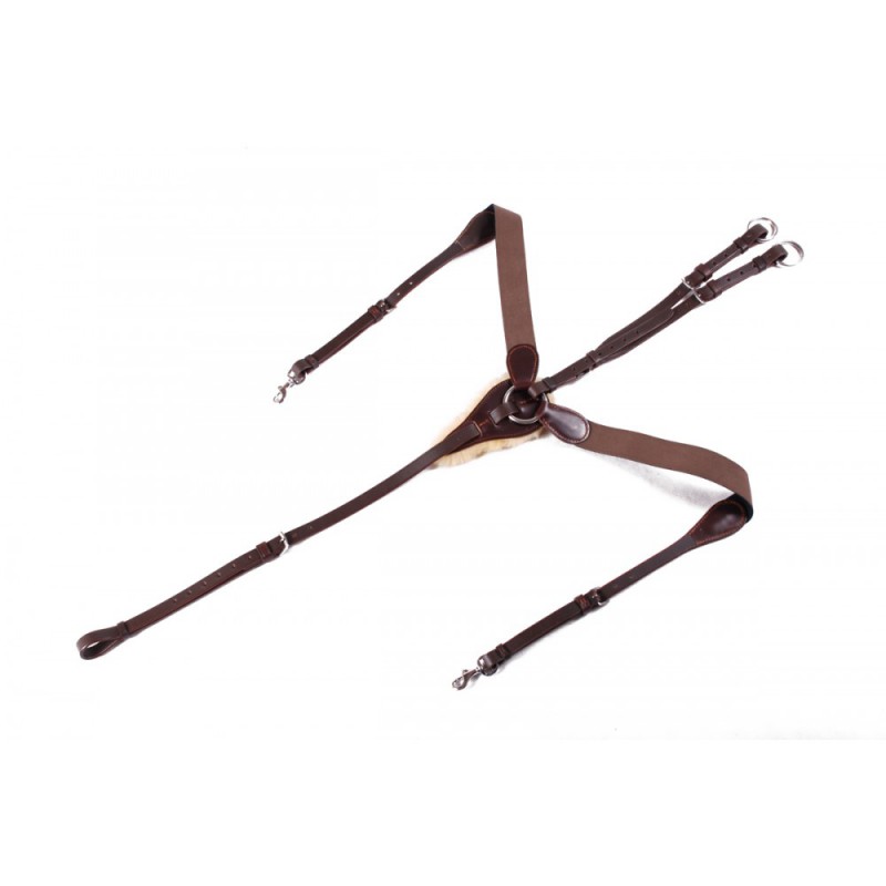Napierśnik skokowy wykonany z elastycznych pasów pozwalających na zachowanie lepszej swobody ruchu zwierzęcia podczas konkursów skoków. System regulacji wykonany ze skóry dla zwiększenia wytrzymałości całego napierśnika, pozwala na dopasowanie dodatkowe w ramach danego rozmiaru. Na części piersiowej posiada podkład z miękkiego futerka.