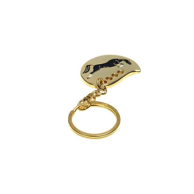 Masywny, płaski breloczek, wykonany z metalu z pięknym wizerunkiem konia w skoku o oryginalnym, zaokrąglonym kształcie.
