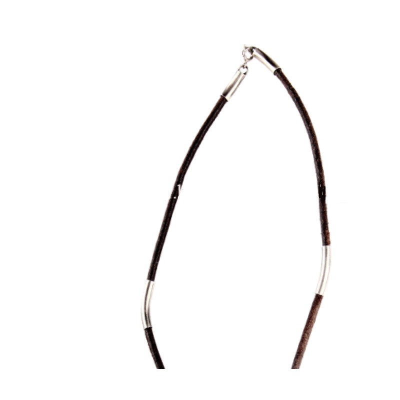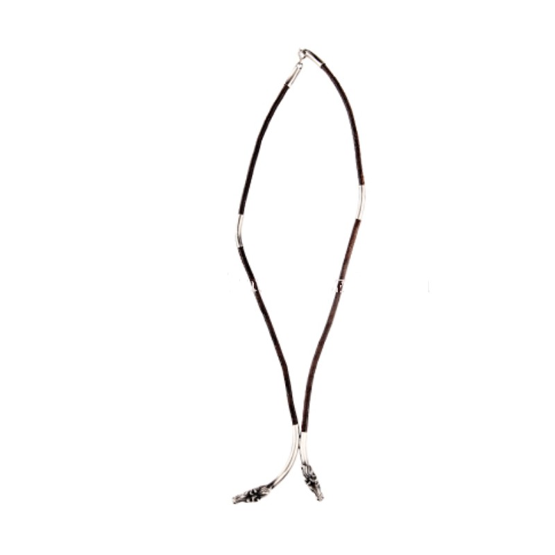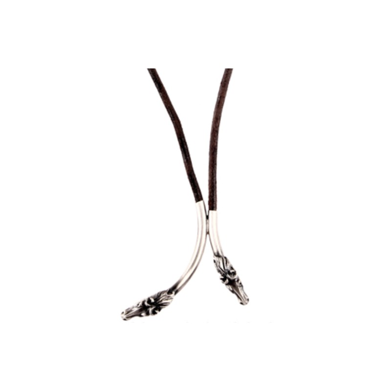 Srebrny naszyjnik na rzemieniu z motywem dwóch końskich łbów.