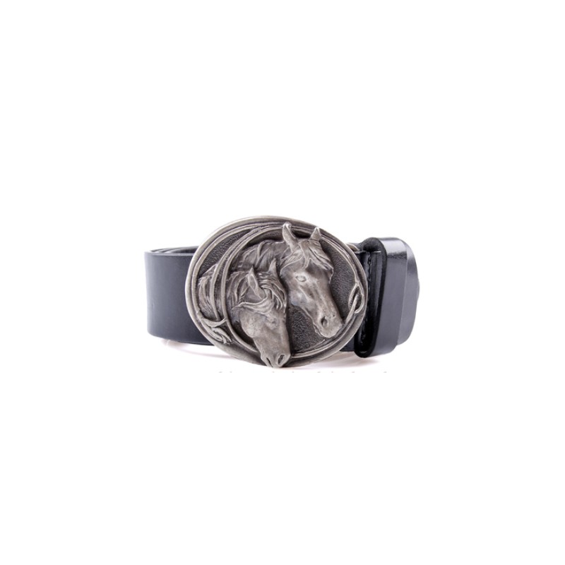 Elegancki, szeroki pasek z klamrą mosiężną posrebrzaną z motywem końskich łbów lasso.