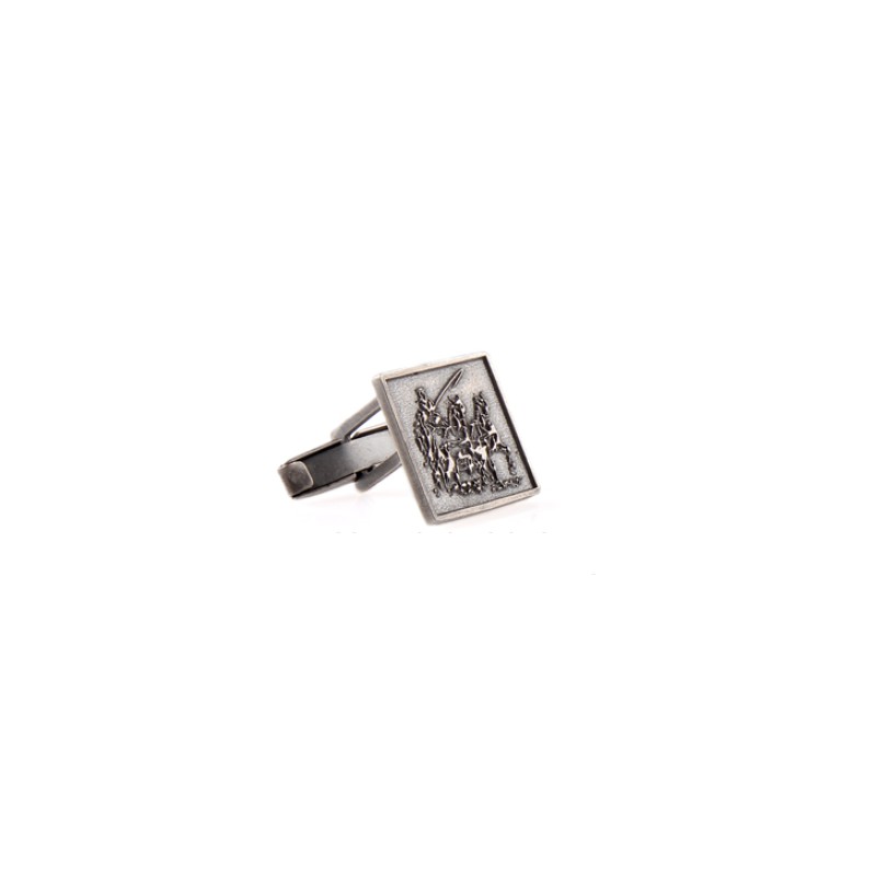 Eleganckie spinki wraz ze szpilką do krawata z motywem powozu konnego.