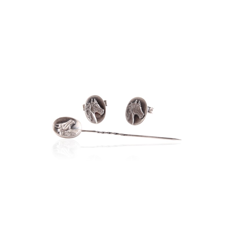 Eleganckie spinki wraz ze szpilką do krawata z motywem łba końskiego.