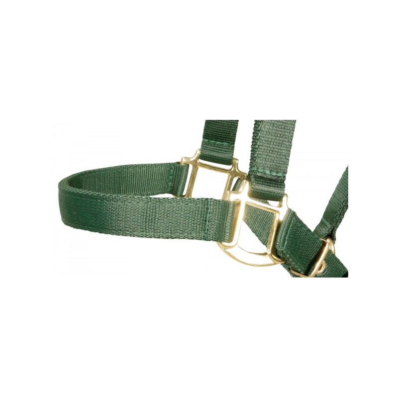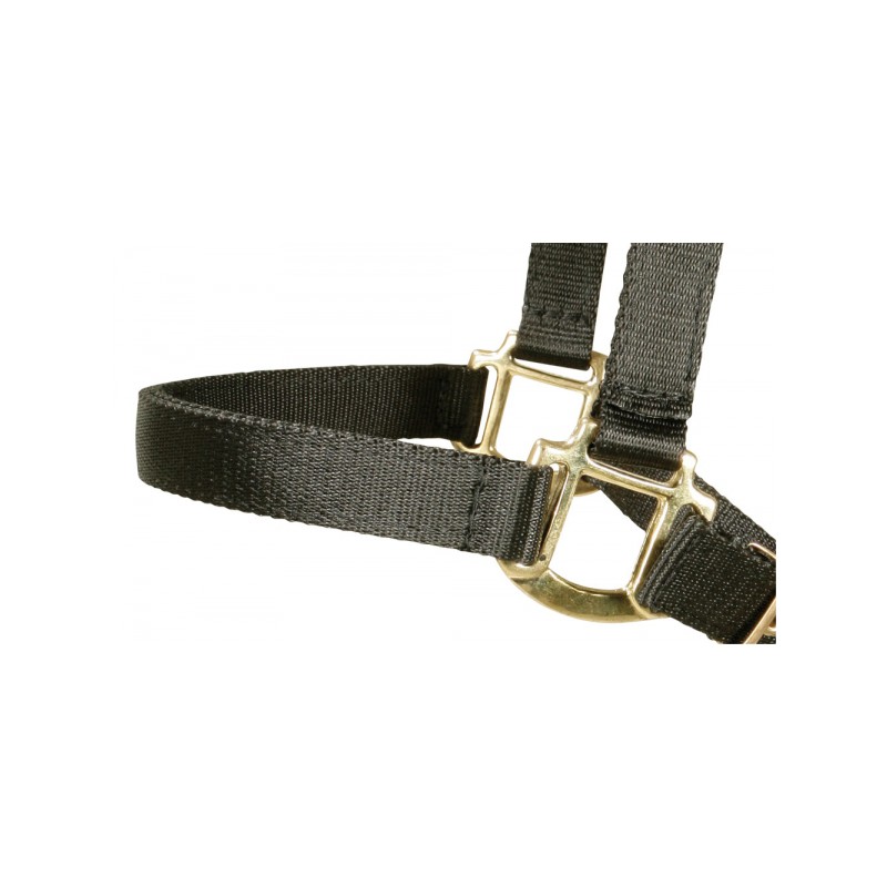 Wytrzymały kantar z podwójną regulacją. Okucia mosiądzowane. Wykonany z taśmy poliestrowej.