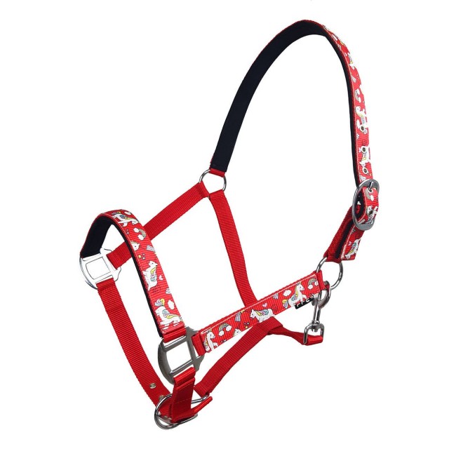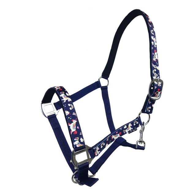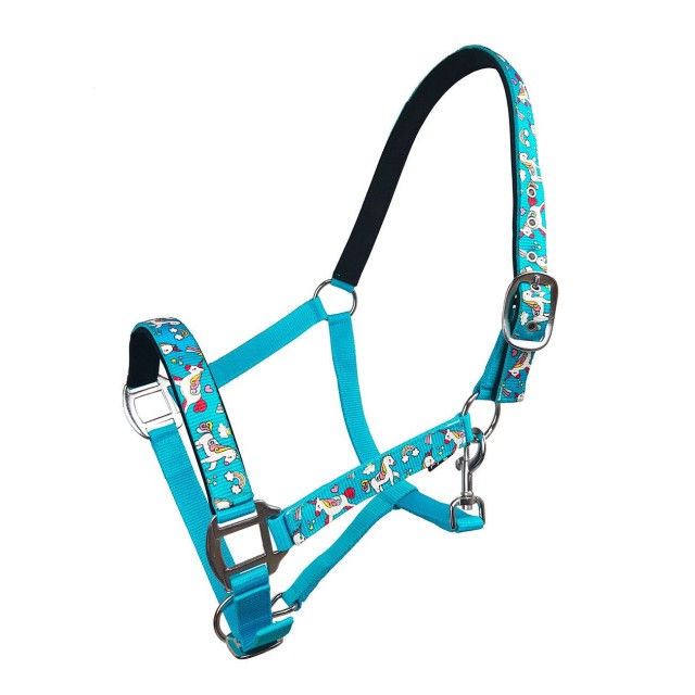 Kantar ozdobiony wesołymi jednorożcami, podszyty imitacją nubuku. Posiada regulację na potylicy oraz nachrapniku.