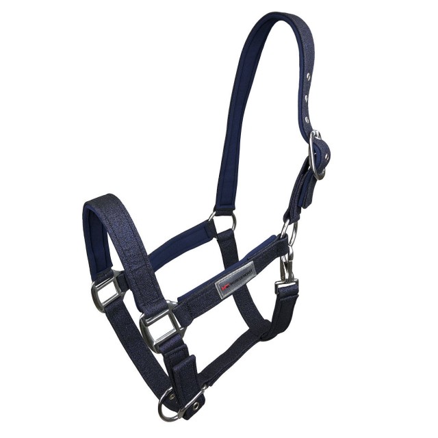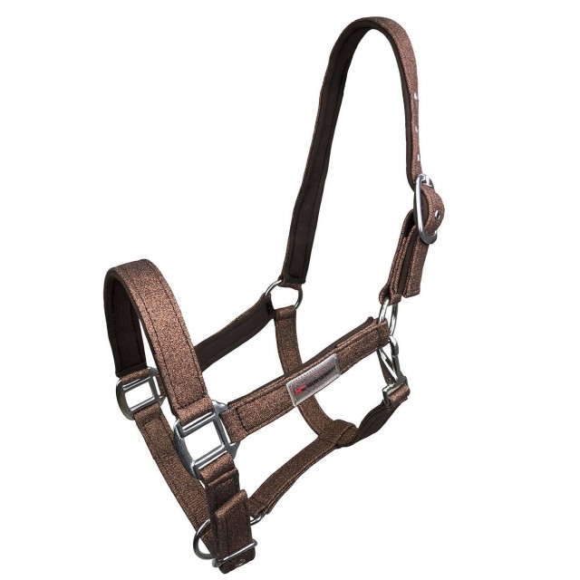 Wyjątkowo szykowny wzór kantara, który zachwyca delikatną, brokatową taśmą jako dekoracją. Paski na policzkach, nachrapnik oraz pasek potyliczny są dodatkowo wyściełane miękkim neoprenem, co zapewnia komfort noszenia. Możliwość dostosowania rozmiaru zarówno na pasku potylicznym, jak i na nachrapniku. Okucia w srebrnym kolorze.