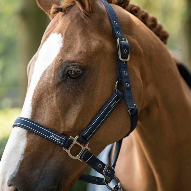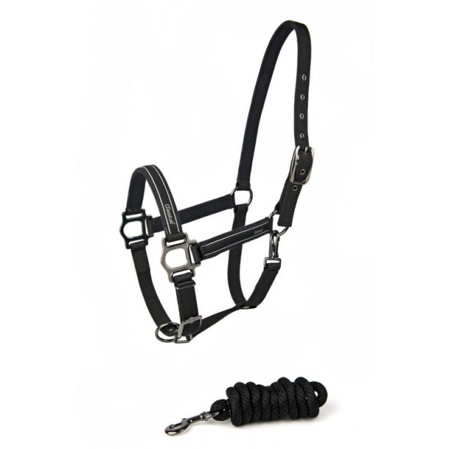 Elegancki kantar dla konia. Kolor czarny, z czarnymi niklowanymi sprzączkami i zamszowym podszyciem. Sprzedawany z uwiązem.