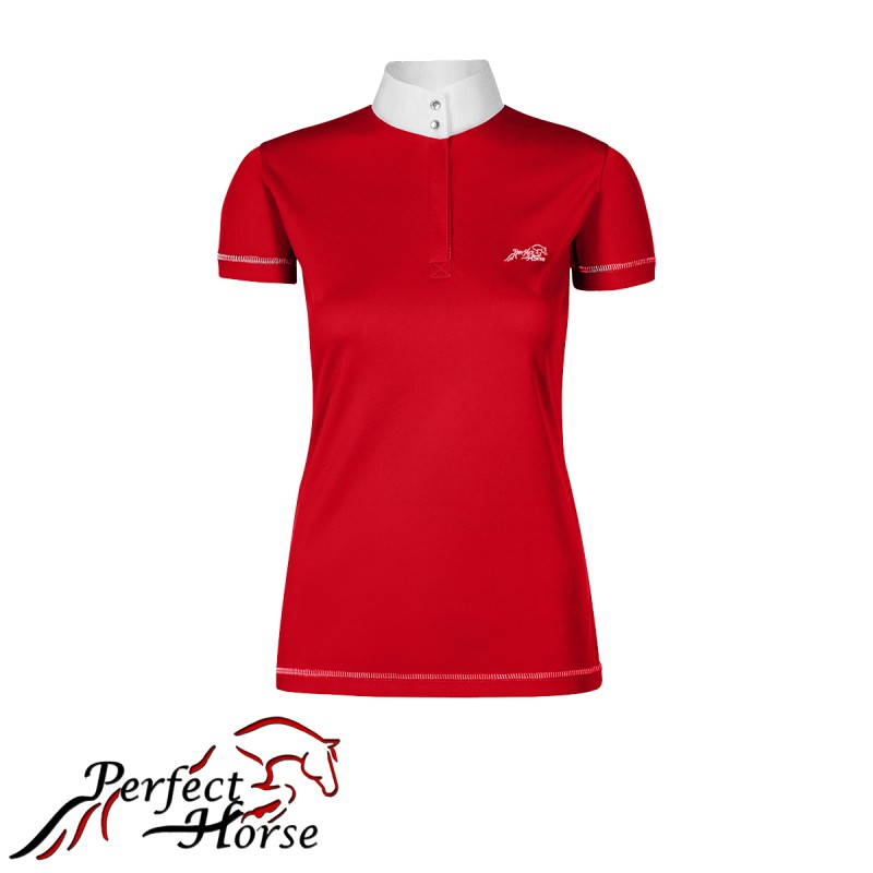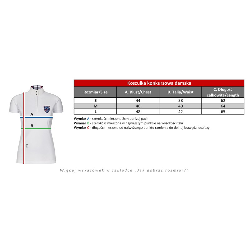 Wykonana z najwyższej jakości oddychającego materiału damska koszula konkursowa. Tkanina posiada dodatek Clariant, dzięki któremu skóra pozostaje sucha. Zapewnia maksymalny komfort użytkowania i wygodę podczas jazdy. Stójka zapinana na dwie napy ozdobione kamyczkami. Dwa srebrne hafty oraz wykończenie srebrną nitką tworzy harmonijną całość.