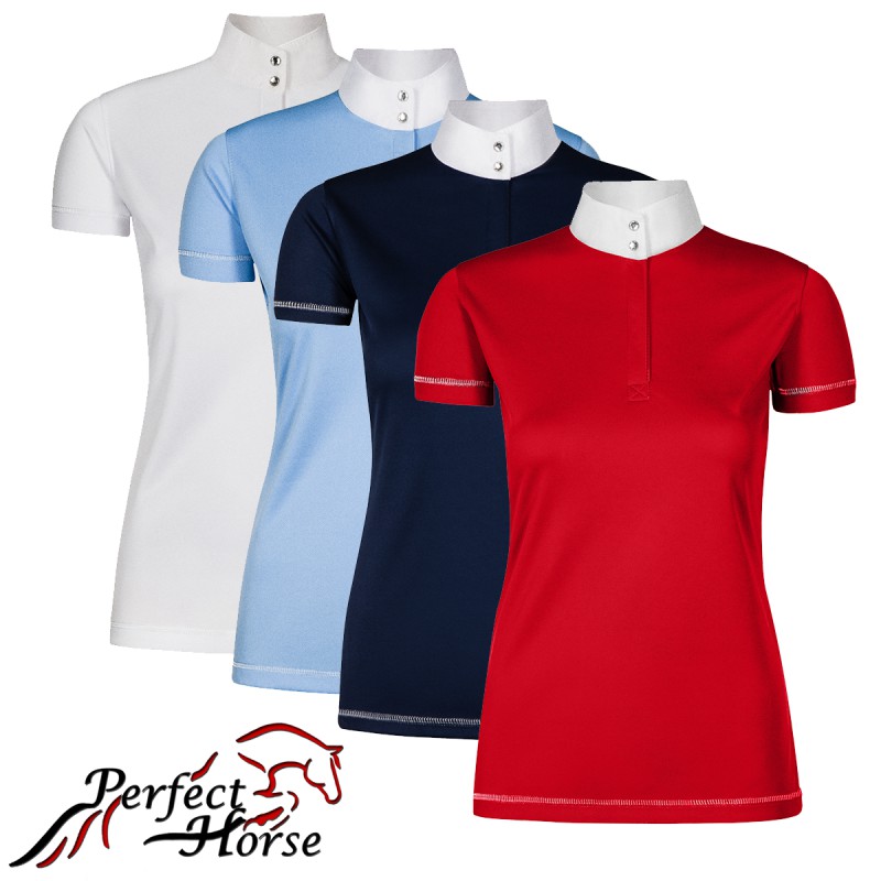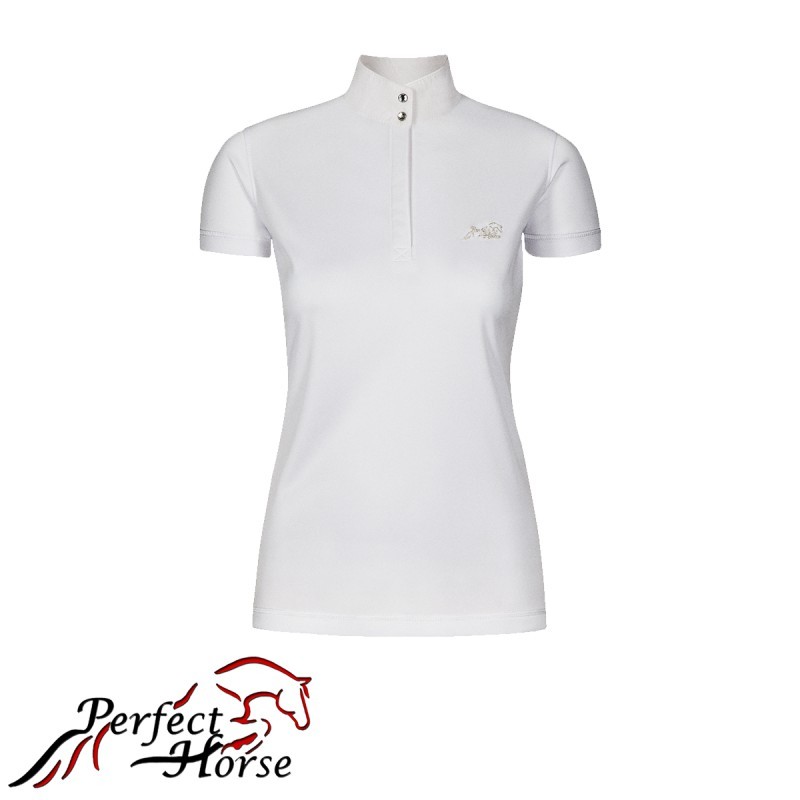 Koszulka konkursowa damska wykonana z najwyższej jakości oddychającego materiału z dodatkiem clariantu, który zapewnia ochronę, komfort i wygodę podczas jazdy, a skóra pozostaje sucha. Stójka z ozdobnymi guzikami na napy ułatwiająca zakładanie.
