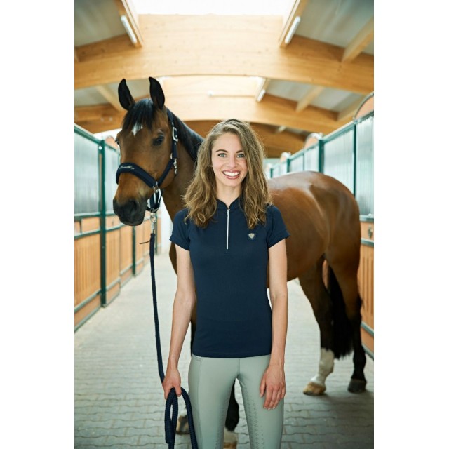 Wykonana z miękkiej i przewiewnej dzianiny. Świetnie odprowadza wilgoć na zewnątrz i bardzo szybko schnie. Posiada taliowany, kobiecy krój podkreślający sylwetkę oraz miękką stójkę zapinaną na wygodny zamek. Wykończona subtelnym logo Covalliero na piersi.