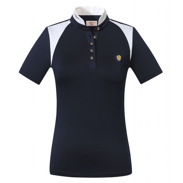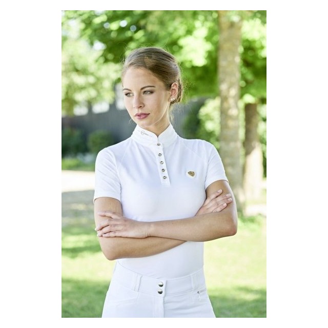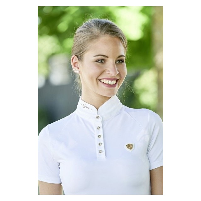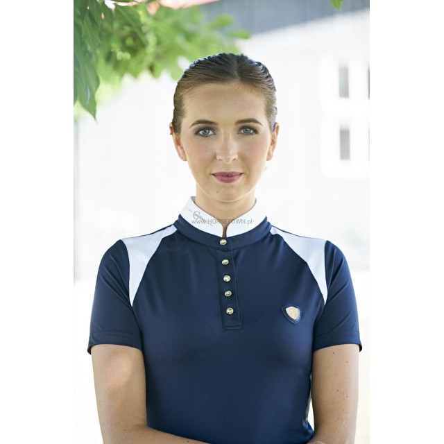 Koszulka wykonana została z szybkoschnącego oraz elastycznego w czterech kierunkach materiału odprowadzającego pot. Koszulka posiada dopasowany krój, elegancką stójkę z ozdobnymi kryształowymi guzikami.