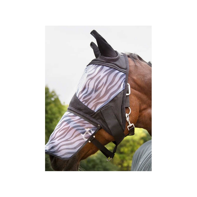 Maska przeciw owadom z wzorem w paski zebry. Jak wnoszą badania naukowe paski zebry działają dezorientująco na natarczywe owady. Dodatkowa ochrona nosa- nosecover, którą można zdemontować (na zamek błyskawiczny).