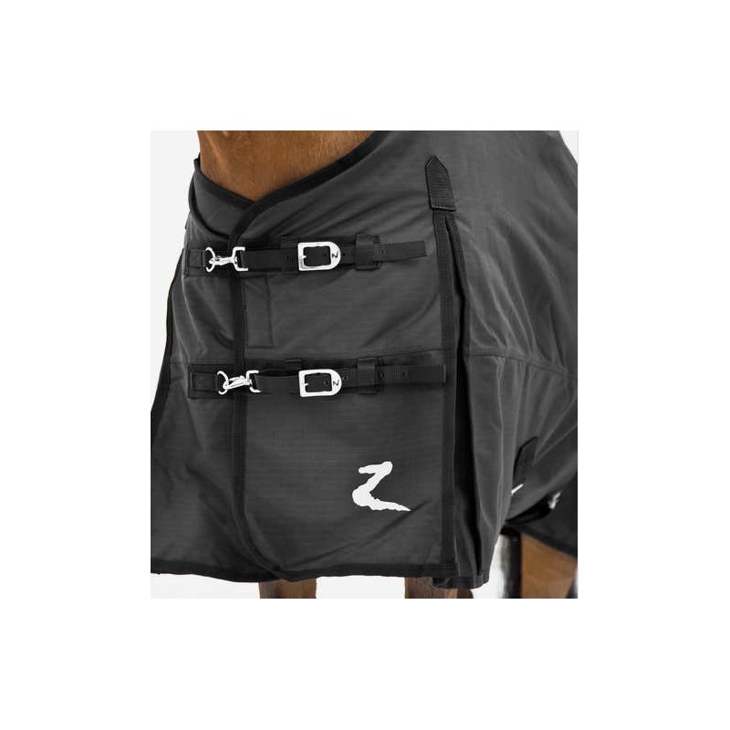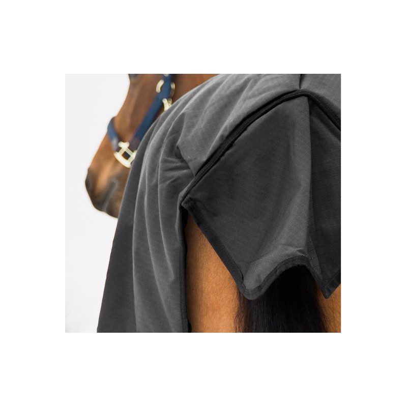 Zimowa derka padokowa z wyciepleniem 100g. Wykonana z odpornego na rozdarcia, grubego materiału Rip Stop 1200D. Dobrze dopasowana, posiada rozcięcia w okolicy łopatek, podszycie w okolicy kłębu, klapę na ogon Z przodu zapinana na dwa karabińczyki i rzep, pod brzuchem pasy krzyżowe oraz elastyczne pasy na tylne nogi.