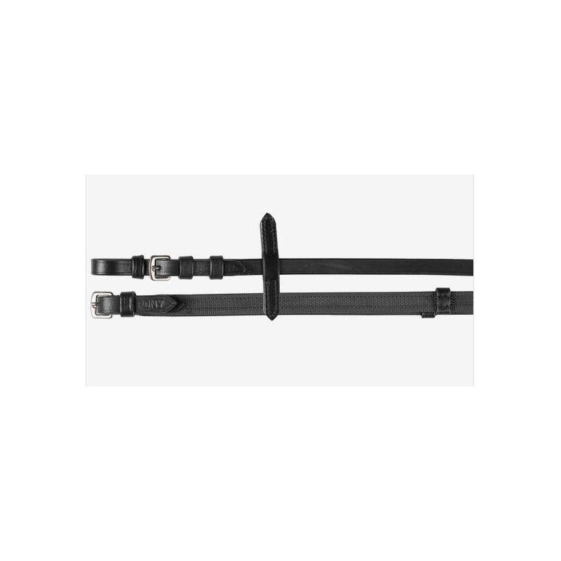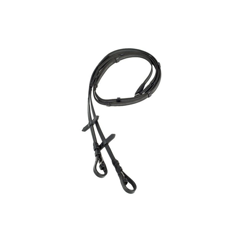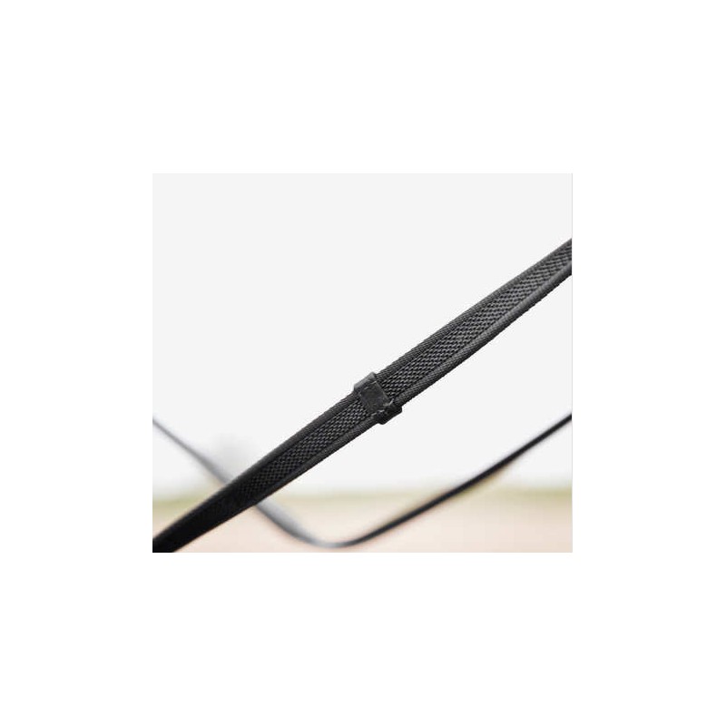 Wąskie 16mm, antypoślizgowe wodze parciane, przeplatane gumą. Wyposażone w stopery oraz motylki do wytoku. Zapinane na klasyczne sprzączki. Elementy metalowe wykonane ze stali nierdzewnej.
