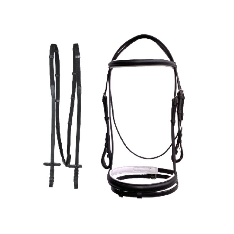 Ogłowie wykonane z dobrej jakości miękkiej skóry. Posiada białe poszycie i parciane wodze w komplecie.