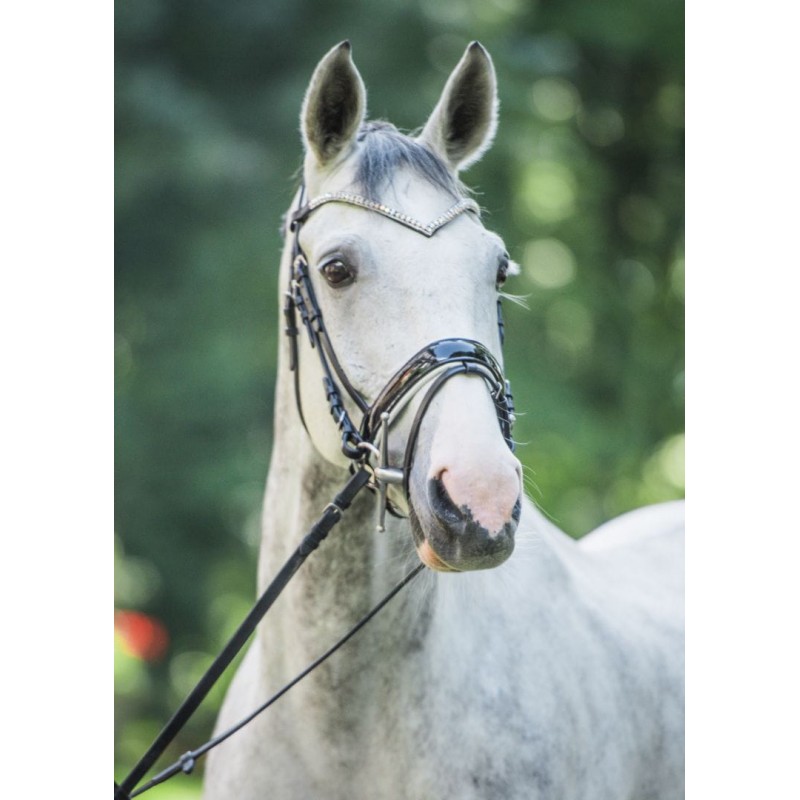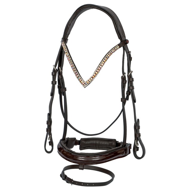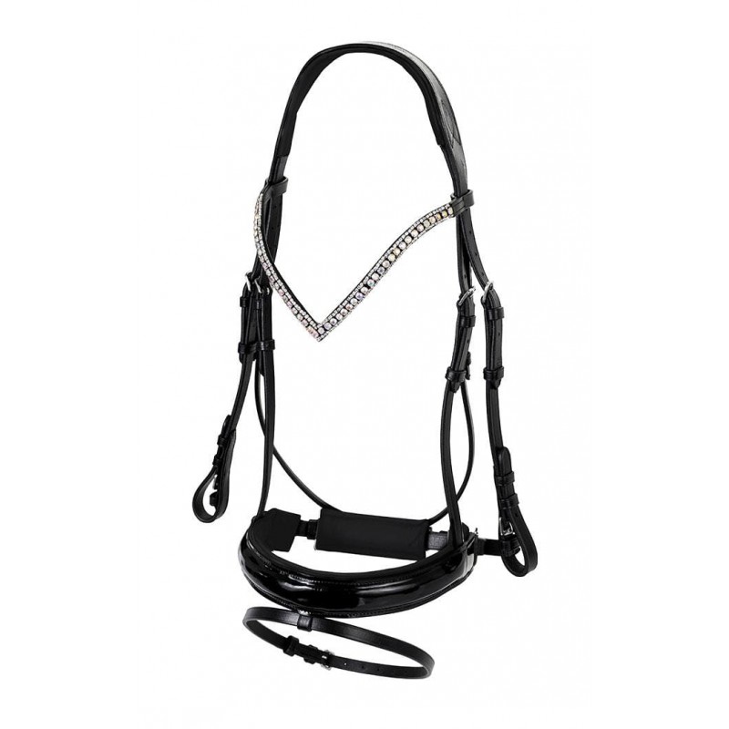Ogłowie z obustronnie zapinanym nachrapnikiem szwedzkim wykonane z wysokiej jakości skóry. Na nachrapniku i potylicy miękko podszyte. Posiada przepiękny opadający naczółek w kształcie V ozdobiony trzema rzędami kryształków. Nachrapnik błyszczący, lakierowany. Elementy metalowe wykonane ze stali nierdzewnej. W komplecie z wodzami parcianymi.