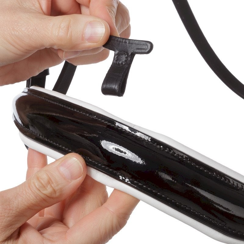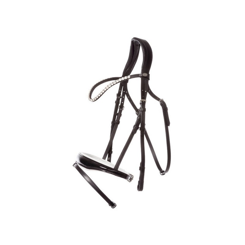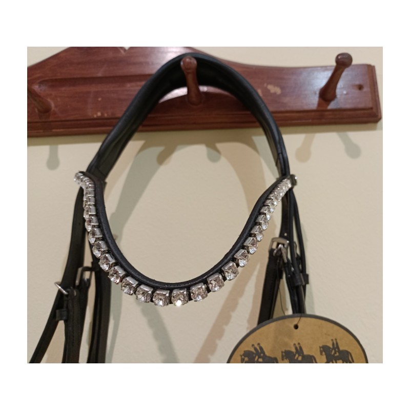 Ogłowie posiada anatomicznie wyprofilowany pasek potyliczny, nachrapnik szwedzki z wypinanym skośnikiem, naczółek opadający z ozdobnymi kryształkami, wodze gumowe oraz mocne sprzączki w kolorze srebrnym. Zostało miękko podszyte czarną skórą w części potylicznej i nachrapniku.