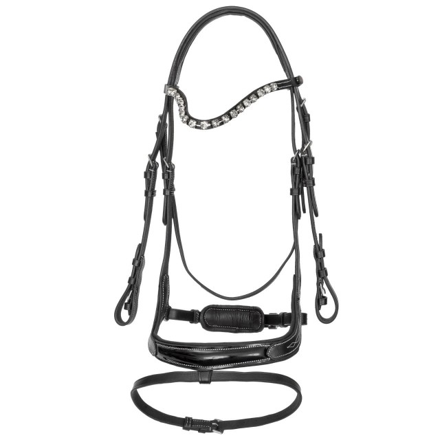 To ogłowie wykonane zostało z najwyższej jakości skóry, z anatomicznym, lakierowanym nachrapnikiem. Jego wyjątkowym elementem jest opadający naczółek, ozdobiony dużymi cyrkoniami o średnicy 1 cm, dodającymi mu efektownego wyglądu. Dodatkowo, posiada białe przeszycia oraz w zestawie znajdują się gumowane wodze.