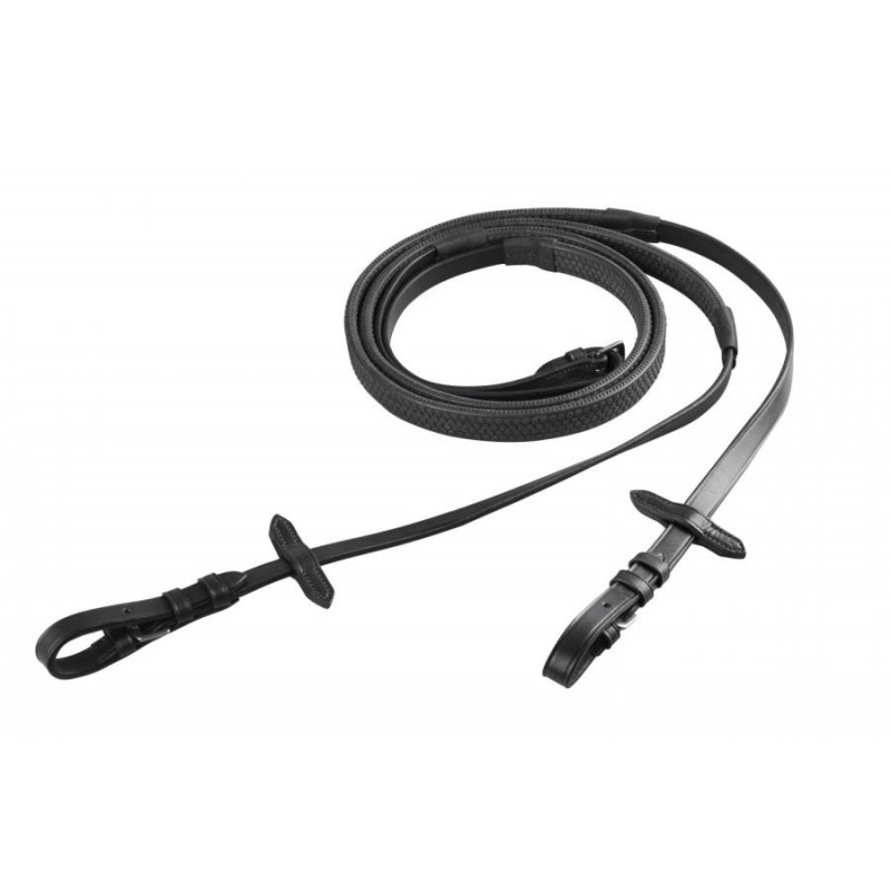 Wytrzymałe gumowe wodze z zapewniającym stabilny chwyt wzorem antypoślizgowym. Zapinane na klasyczne sprzączki. Posiadają motylki do wytoku.