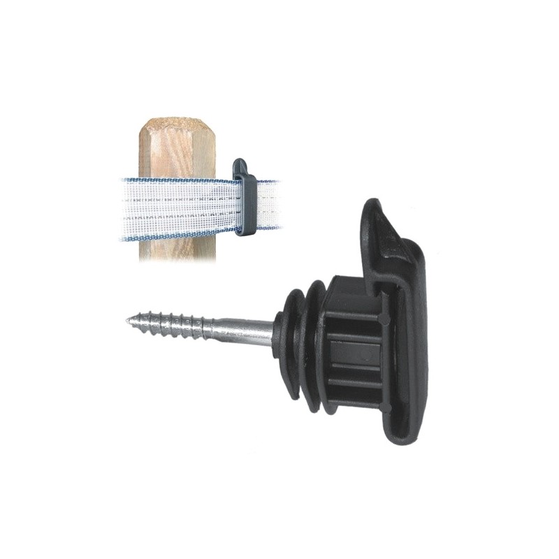 Izolator posiada specjalny zatrzask przytrzymujący taśmę, co daje jej możliwość napięcia i zapobiega zwijaniu się, oraz uszkodzeniom. Wkręcany w drewno.