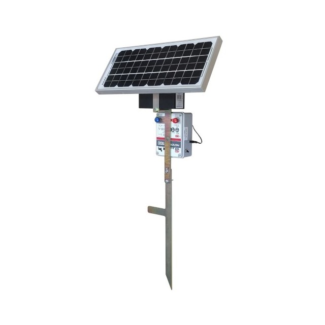 Elektryzator (pastuch elektryczny) do elektrycznych ogrodzeń pastwisk z panelem słonecznym 10W i akumulatorem 12V. Zapewnia znakomitą autonomię zasilania ogrodzenia elektrycznego. Idealny dla zwierząt łatwych w dozorze oraz wrażliwych na impuls elektryczny: konie, bydło mleczne, drób, trzoda chlewna itd.