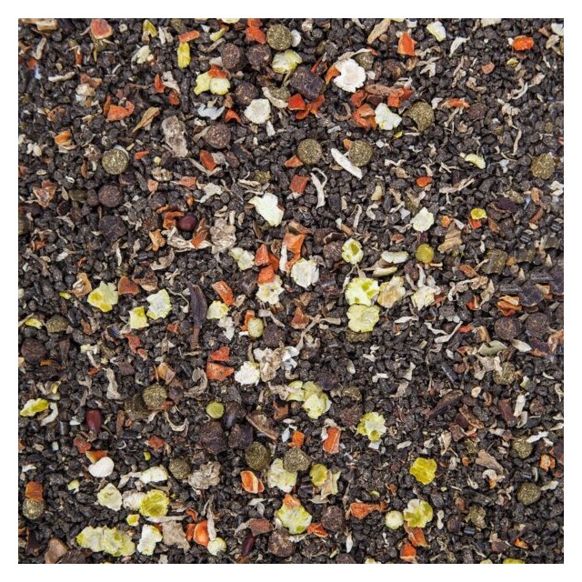 Skład: Poekstrakcyjna śrutasłonecznikowa, łuski z nasion słonecznika, wytłoki z jabłek, cykoria, mączka z traw, strąki chleba świętojańskiego, płatki grochu, makuch z siemienia lnianego, płatki suszonej marchwi, gniecione siemię lniane, olej słonecznikowy, węglan wapnia, suszone drożdże piwne, olej lniany, nasiona psyllium (babka płesznik), chlorek sodu, fosforan jednowapniowy, oregano, rumianek, tlenek magnezu