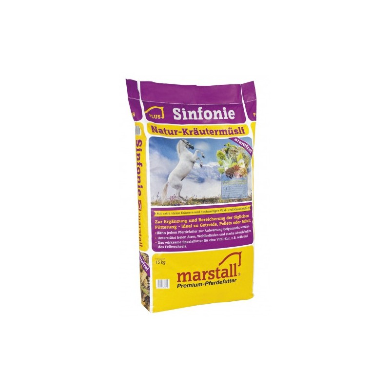Bez owsa, ale za to z wieloma komponentami takimi jak: nasiona lnu, chmiel, melasa oraz wieloma ziołami w naturalnej postaci (anyżek, rumianek, czosnek, tymianek, koriander, eukaliptus i inne). SINFONIE udrażnia u koni drogi oddechowe. Jest idealnym pokarmem dla koni seniorów.