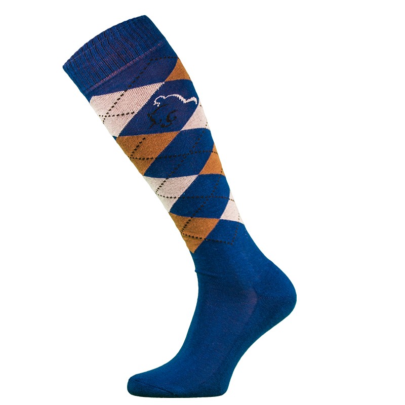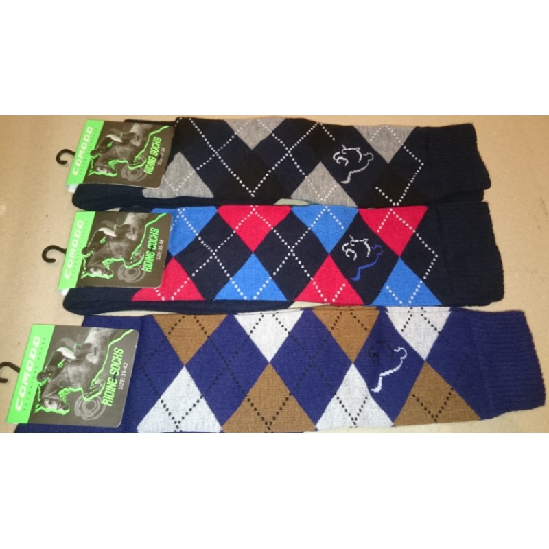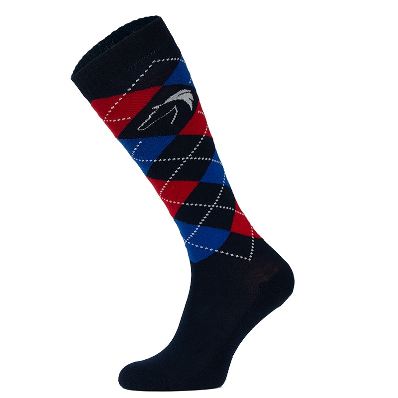 Wysokiej jakości skarpety jeździeckie, z klasycznym wzorem w romby. Posiadają wygładzone szwy w okolicach palców, podwójny ściągacz utrzymujący skarpetę w odpowiednim miejscu a także wzmocnienia w okolicach palców i pięt