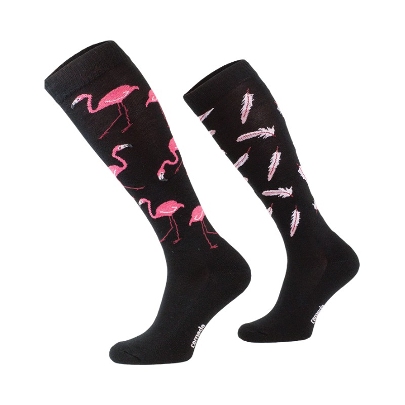 Wysokiej jakości skarpety jeździeckie, z zabawnym wzorem z motywem flamingów oraz piórek. Posiadają wygładzone szwy w okolicach palców, podwójny ściągacz utrzymujący skarpetę w odpowiednim miejscu a także wzmocnienia w okolicach palców i pięt