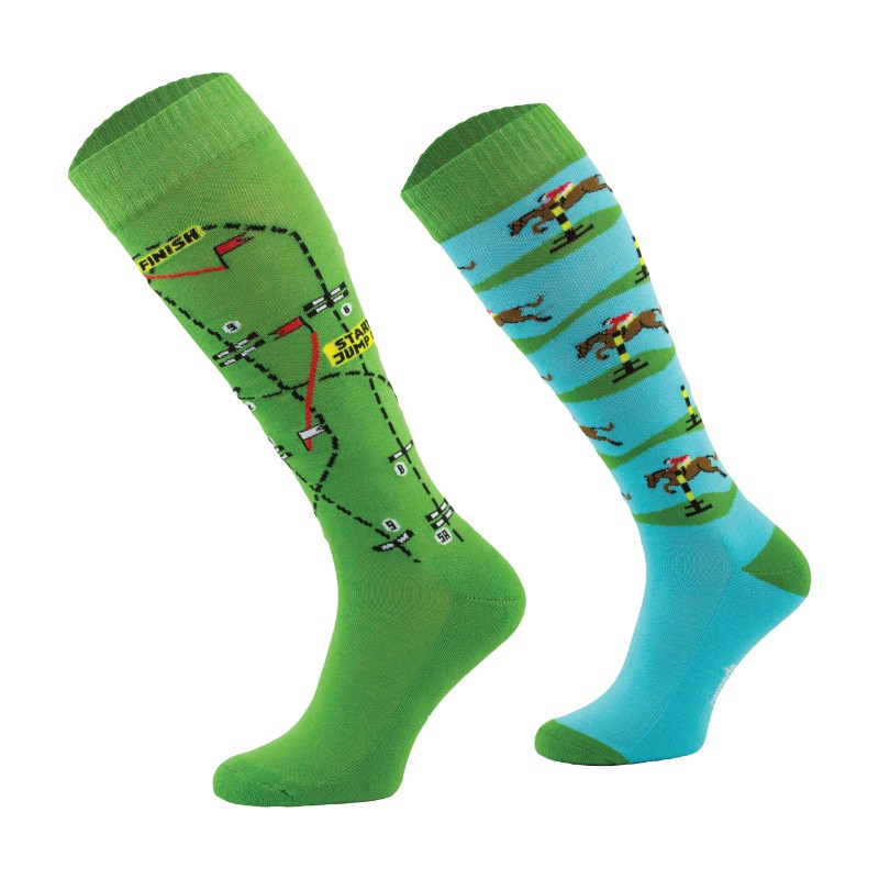 Wysokiej jakości skarpety jeździeckie, z zabawnym motywem zawodów jeździeckich. Posiadają wygładzone szwy w okolicach palców, podwójny ściągacz utrzymujący skarpetę w odpowiednim miejscu a także wzmocnienia w okolicach palców i pięt