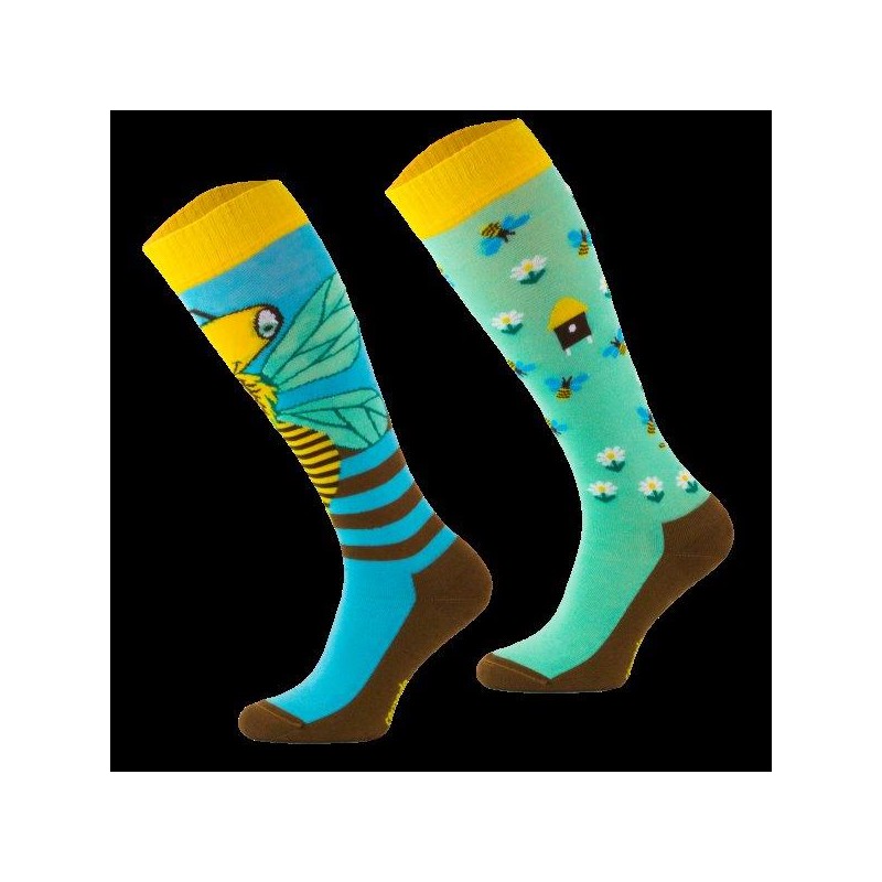 Wysokiej jakości skarpety jeździeckie, z zabawnym wzorem w pszczółki z ulami. Posiadają wygładzone szwy w okolicach palców, podwójny ściągacz utrzymujący skarpetę w odpowiednim miejscu a także wzmocnienia w okolicach palców i pięt