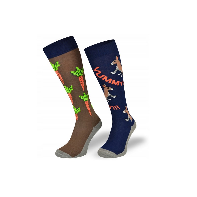 Wysokiej jakości skarpety jeździeckie, z zabawnym motywem osiołków z marchewkami. Posiadają wygładzone szwy w okolicach palców, podwójny ściągacz utrzymujący skarpetę w odpowiednim miejscu a także wzmocnienia w okolicach palców i pięt