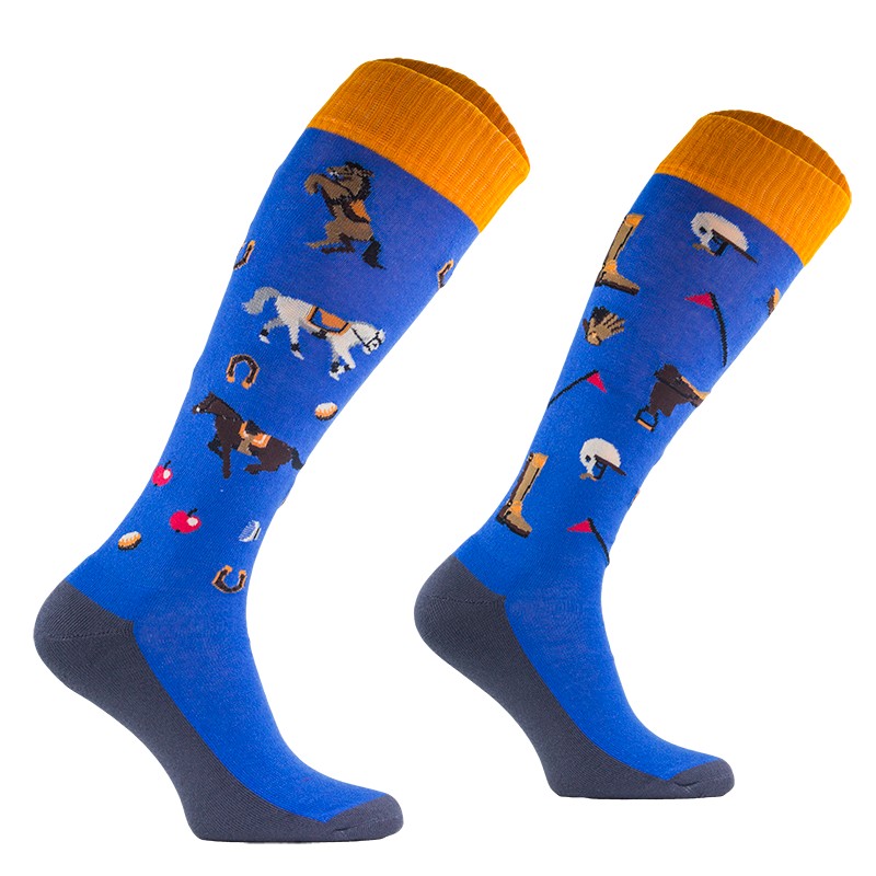 Wysokiej jakości skarpety jeździeckie, z niebanalnym wzorem w "konie". Posiadają wygładzone szwy w okolicach palców, podwójny ściągacz utrzymujący skarpetę w odpowiednim miejscu a także wzmocnienia w okolicach palców i pięt.
