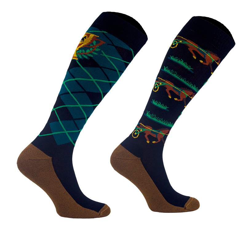 Wysokiej jakości skarpety jeździeckie, z niebanalnym wzorem w konie zaprzęgowe. Posiadają wygładzone szwy w okolicach palców, podwójny ściągacz utrzymujący skarpetę w odpowiednim miejscu a także wzmocnienia w okolicach palców i pięt.