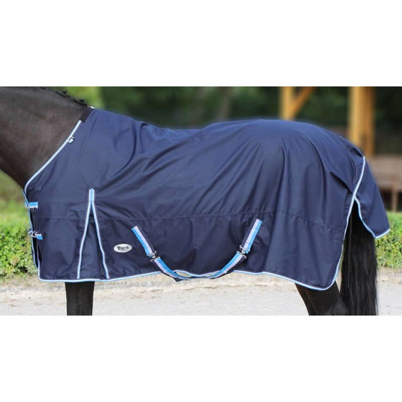 Derka przeciwdeszczowa uszyta z materiału o grubości 600 D, podszyta materiałem poliestrowym. Posiada klapę na ogon, rozcięcia w okolicy łopatek, podszycie w okolicy kłębu. Z przodu zapinana na dwa karabińczyki i rzep, posiada pasy krzyżowe pod brzuchem wyposażone w elastyczną wstawkę oraz elastyczne pasy mocujące na tylne nogi.