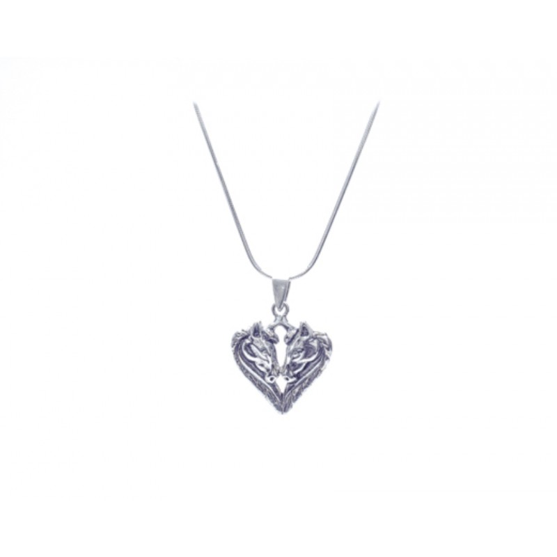 Srebrny wisiorek z motywem serca złożonego z dwóch końskich łbów. Bardzo elegancki.