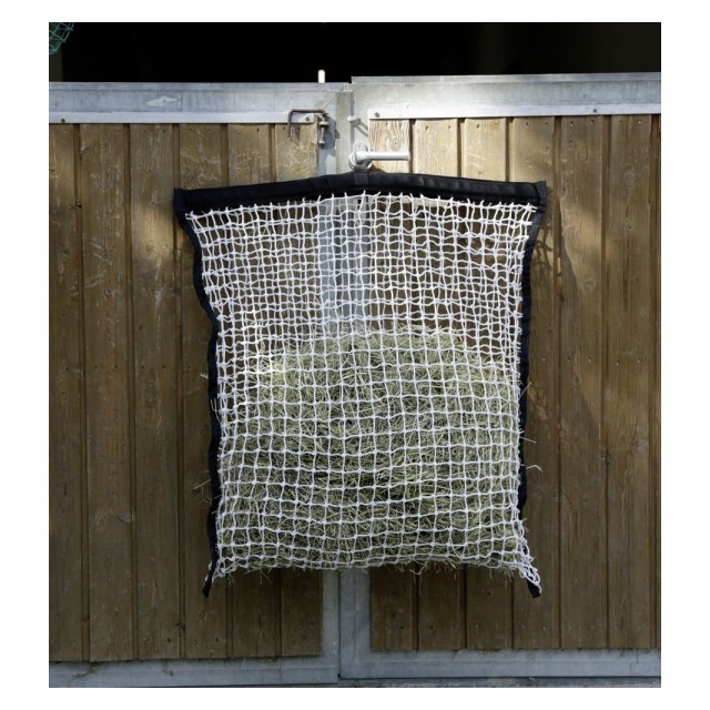Średniej wielkości, wytrzymała siatka na siano o wymiarach 83 x 83 cm i rozmiarze oczek 3 x 3 cm. Wzmocniony rzep przy otworze zapobiega przypadkowemu otwarciu worka na siano, a praktyczny haczyk do zawieszania, może również służyć jako pomoc przy napełnianiu.